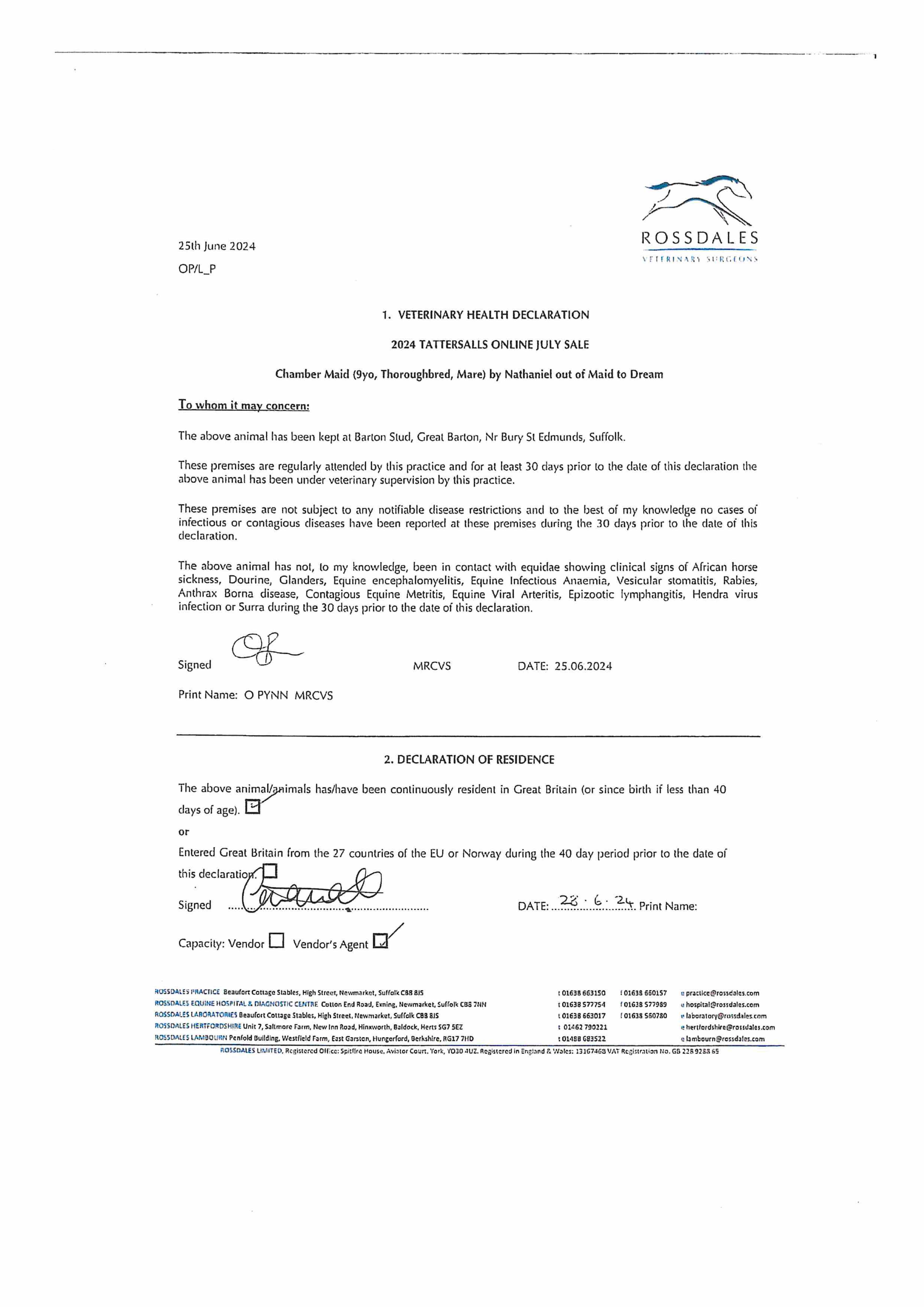 Vendor's Notes: Chamber Maid (GB) B.M. by Nathaniel (IRE) x Maid To Dream (GB)